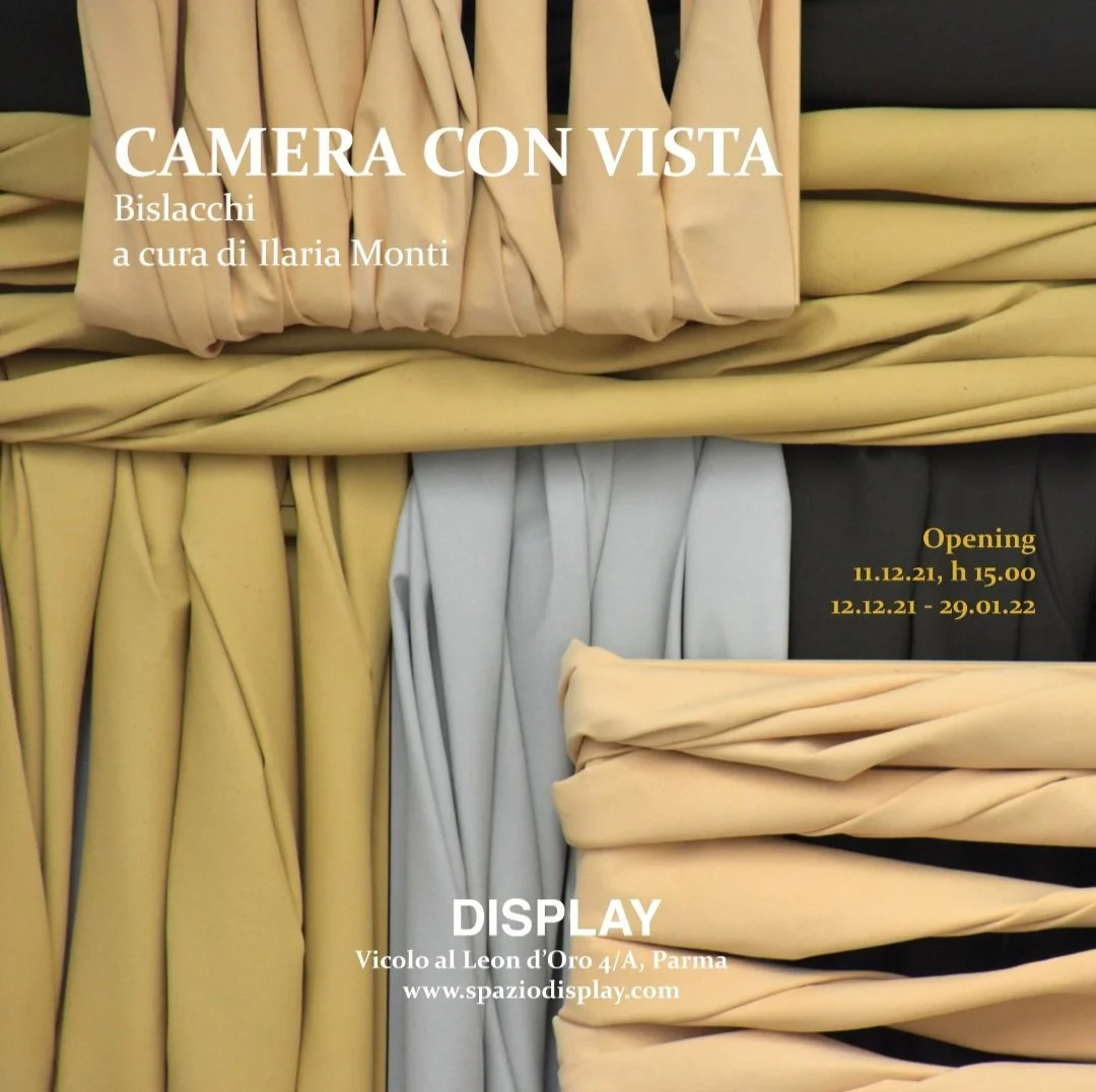 Tela, telaio e colore. Da supporto pittorico a elemento strutturale, alla galleria DISPLAY di Parma vanno in scena le conversioni di Camera con vista, mostra personale di Bislacchi (Matteo Santacroce) con opere realizzate durante la partecipazione al programma VIR Viafarini-in-residence a Milano. A cura di Ilaria Monti, fino al 29 gennaio 2022.